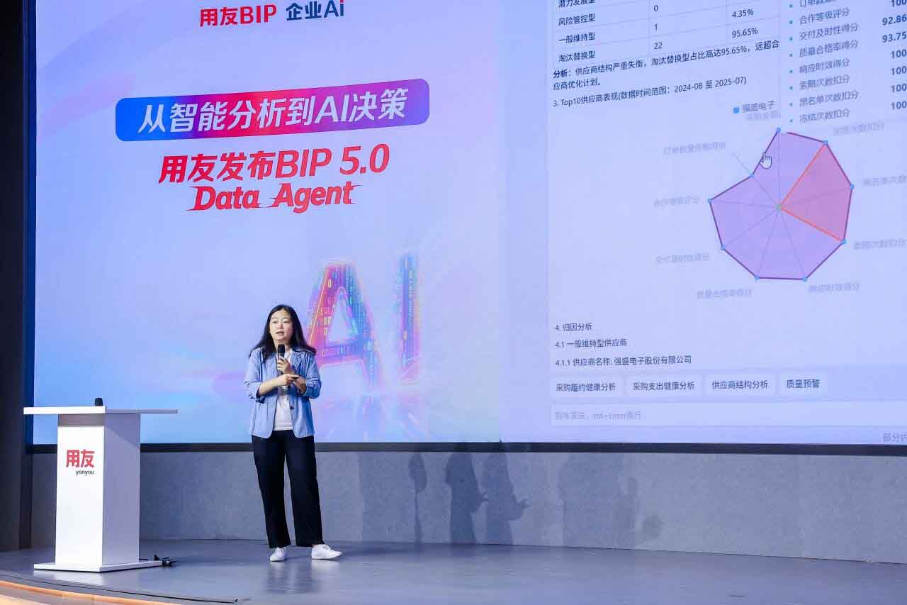 近日,用友正式发布BIP 5.0 Data Agent,标志着企业数据应用迈入“AI决策”新阶段。此次发布会以“从智能分析到AI决策”为主题,全面展示了用友在AI+数据深度融合背景下的最新成果,推出以“企业经营分析助理”“采购分析助理”“库存健康顾问”为代表的一系列Data Agent智能体产品,致力于构建企业智能运营新生态。