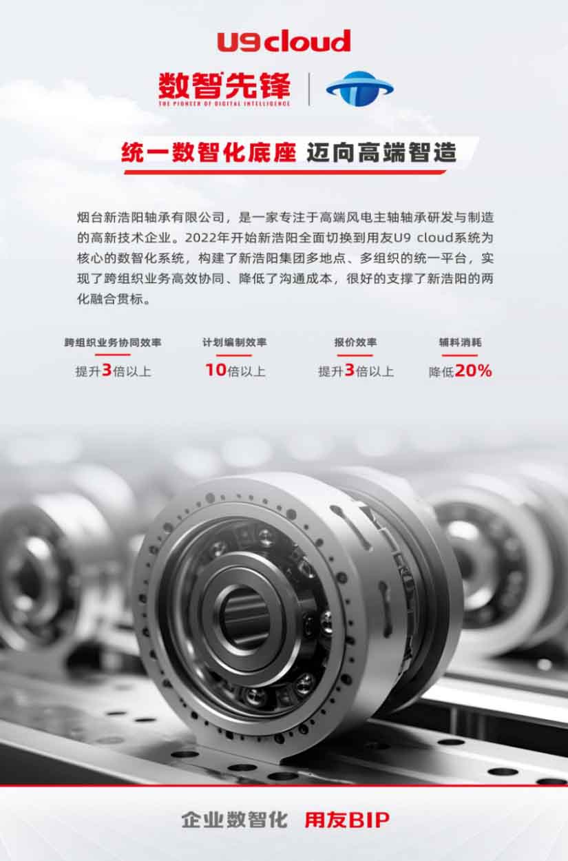 在国家“人工智能 + 行动”战略深入推进的浪潮中,中国制造业正经历着从“制造”到“智造”的深刻变革。烟台新浩阳轴承有限公司作为风电大轴承领域的“小巨人”,率先踏上数智化转型之路,通过与用友 U9 cloud 的深度融合,构建起覆盖“研产供销财”全链路的智能管理体系,不仅实现了运营效率的跨越式提升,更树立了高端装备制造企业数字化转型的新典范。