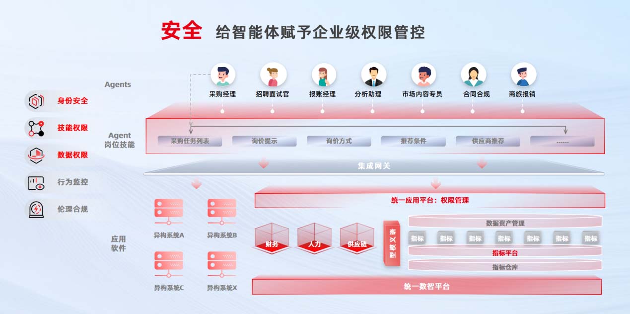 智友已完美融入用友BIP5的统一权限体系。这意味着企业对智能体的访问和使用控制,可以像管理员工系统账号一样精细和严谨,确保数据与功能的安全边界。