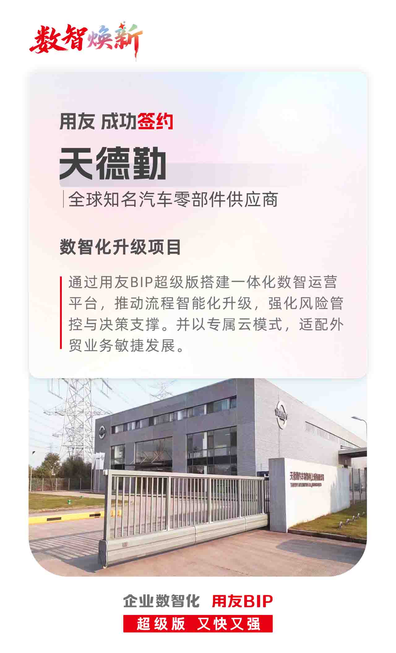 近日,全球知名汽车零部件供应商天德勤与用友达成合作,将通过用友BIP超级版覆盖财务、供应链领域及专属云服务的数智化解决方案,搭建集成、智能的数智运营体系,为其全球汽车零部件贸易业务的持续发展提供有力支撑,树立汽车零部件外贸行业数智化转型标杆。