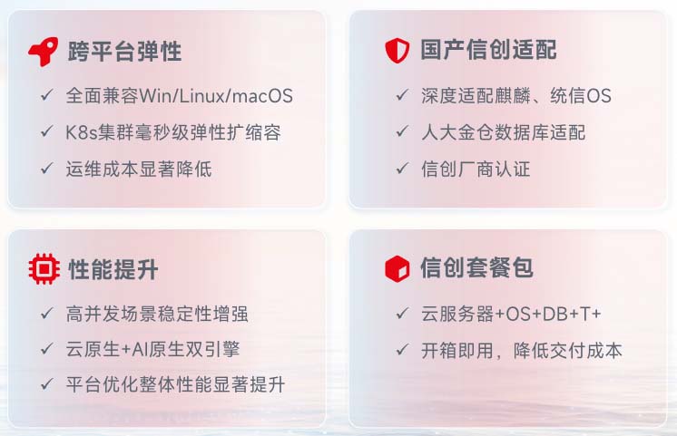 平台支持跨平台部署,具备毫秒级弹性扩缩容能力,显著降低运维成本。同时,深度适配国产信创生态,提供开箱即用的信创套餐包,为企业数智化建设提供安全可控的技术底座。