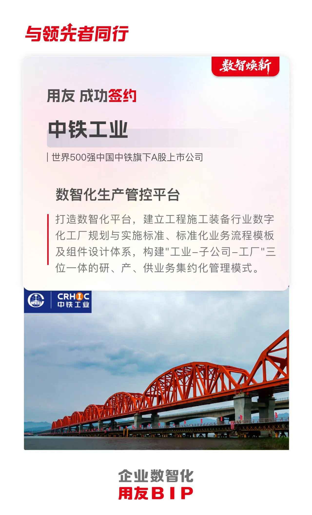 近日,用友成功签约世界500强企业中国中铁旗下A股上市企业——中铁高新工业股份有限公司(以下简称:中铁工业),双方将携手打造数智化生产管控平台。此次合作标志着双方在推进行业数智化升级领域达成深度共识,开启协同发展新篇章。