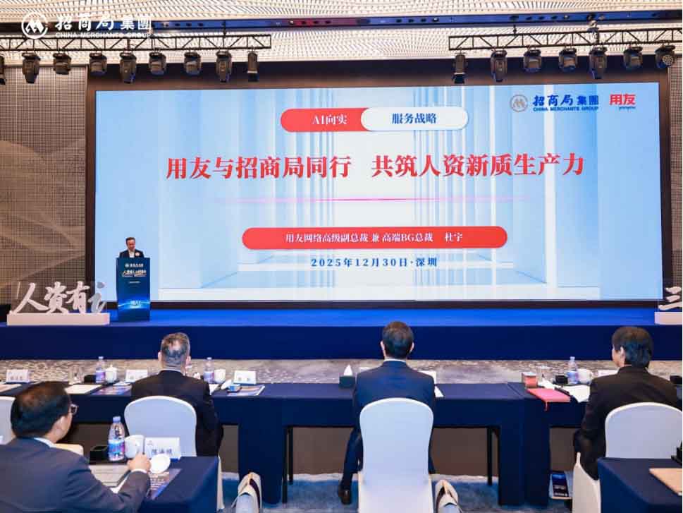 由用友承建的招商局集团人力资源智慧系统(以下简称 “招人 i”)项目(二期)于 2025年12月全面验收。为夯实现有建设成果,并为后续推广应用打下基础,招商局集团同期召开“招人 i”建设成果发布暨深化应用部署大会。本次会议由用友协办,招商局集团副总经理邓仁杰,集团总经理助理、人力资源部部长张锐, 用友高级副总裁杜宇出席会议。标志着用友与招商局集团立足过往精诚合作的坚实基础,迈向新征程。
