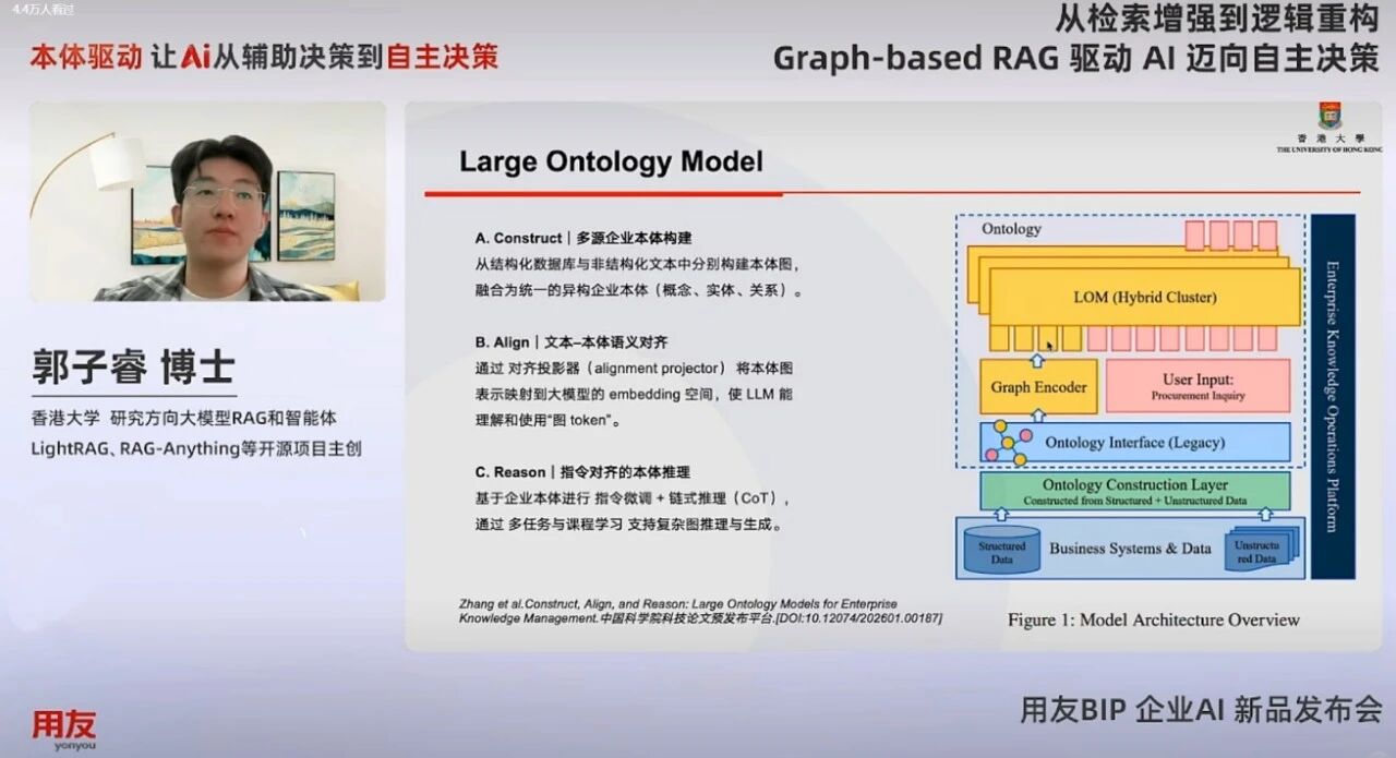 在发布会现场,香港大学博士、LightRAG及RAG-Anything等开源项目主创郭子睿进行了主题演讲。郭博士对用友最新提出的本体大模型LOM做了详细解读,他指出,企业智能化的核心瓶颈在于如何让大模型从“大概率的猜测”转向“逻辑可靠的决策”,并展示了基于图谱的检索增强技术(GraphRAG),通过将图结构融入文本索引,利用实体间的关系网络实现多跳推理。