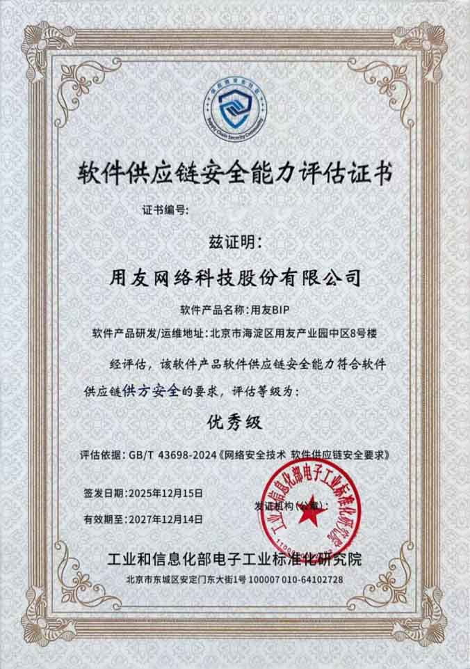 近日,用友BIP通过了工业和信息化部电子工业标准化研究院组织的软件供应链安全能力评估认证(优秀级),成为全国首批通过该项认证的企业。