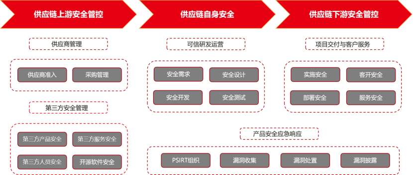 基于多年的行业积累与技术沉淀,用友构建了完善的供应链安全管理体系,从对第三方供应商、产品、服务、人员的安全管理,到内部的可信研发运营和产品安全应急响应,再到对项目交付及客户服务的安全管理,实现了从供应链上游到自身再到下游的整个链条的安全管控。