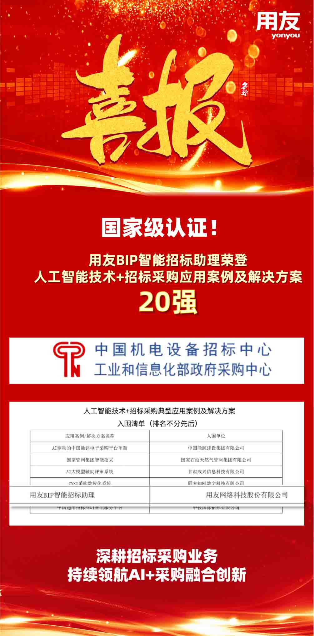 近日,在由中国机电设备招标中心、《中国招标》期刊和招标采购联盟联合发起的“智联招采 引领未来”人工智能技术招标采购应用征集活动中,用友自主研发的“用友BIP智能招标助理”突破重围,成功入选国家级创新解决方案20强!本次活动覆盖全国300余家企业、高校及科研机构,深度聚焦AI与招采融合的前沿实践。用友以其在智能招标领域的突破性创新成果,成为获此国家级权威认证的数智采购解决方案品牌,这代表着用友在AI技术与招标采购深度融合的前沿实践中取得了里程碑式突破。