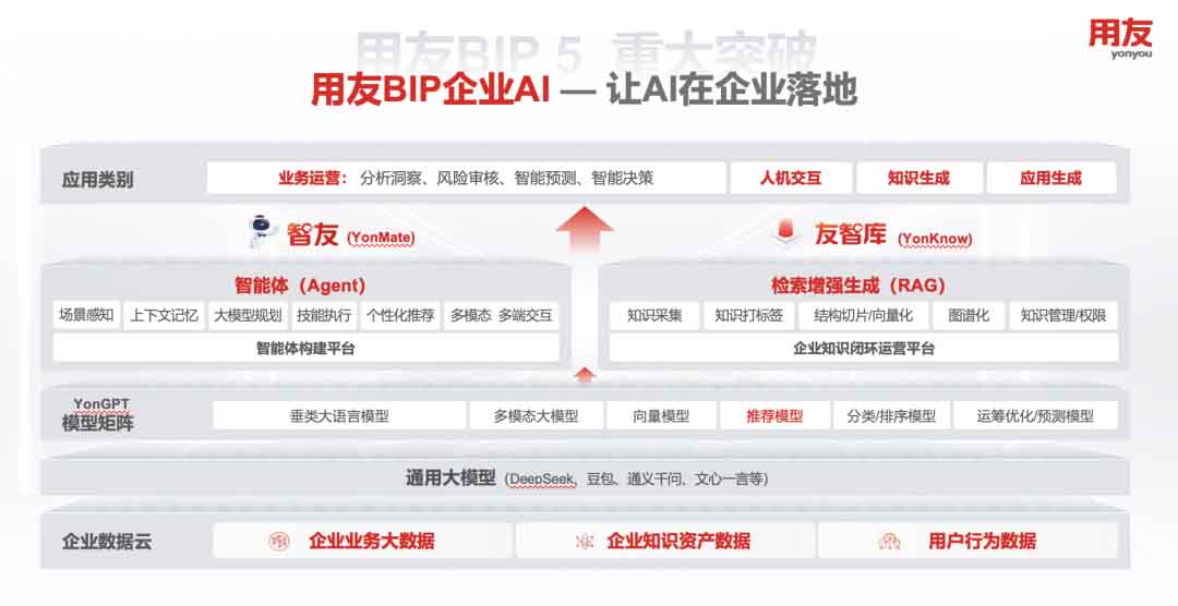 8月16日,用友重磅发布了里程碑新品——用友BIP 5,用友BIP企业AI作为此次发布的重大突破创新,带来了怎样的全新能力?企业AI、智能平台、YonGPT、智友、友智库分别是什么?本文将为您一次梳理清楚用友BIP企业AI的产品矩阵体系。