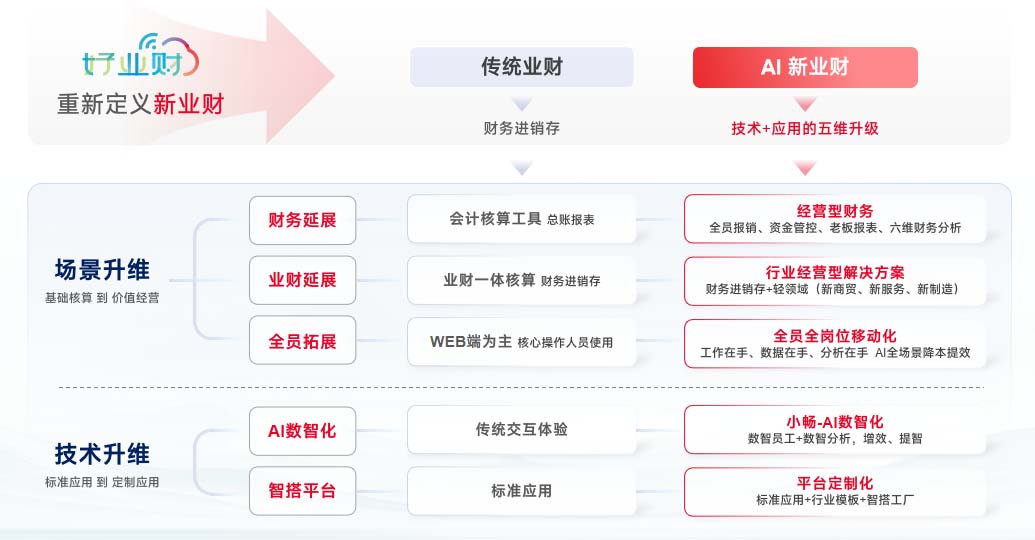 值此关键节点,畅捷通发布好业财AI新业财,通过“技术+应用”的五维升级,开启从“传统业财”到“AI新业财”的深刻变革,重新定义财务进销存,赋能企业迈向智慧经营新纪元。