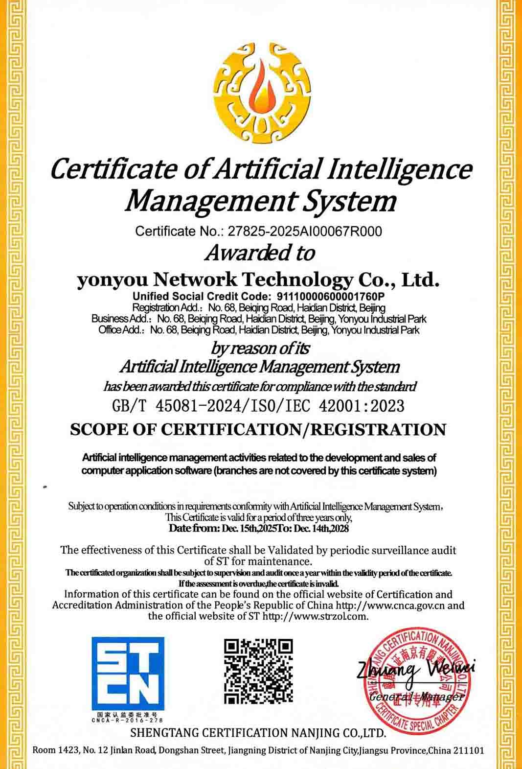 该认证由国际标准化组织(ISO)与国际电工委员会(IEC)联合发布,是全球首个人工智能管理领域国际标准,标志着用友在人工智能系统开发、部署及风险管理领域的管理能力已全面接轨国际领先水平,在技术合规性、伦理规范和数据安全等维度达到行业标杆标准。