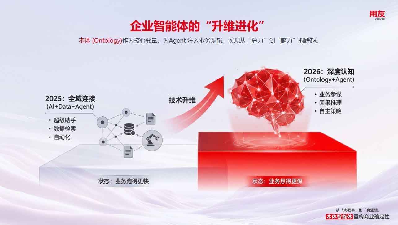 2026年伊始,用友率先引领中国企业软件的AI技术升维,在业界重磅发布BIP“本体智能体”(Ontology-Driven Agent),将企业AI的核心从“概率生成”转向“逻辑执行”,以业务确定性为内核,首次系统化构建了一套面向未来的企业智能新基座,为企业高质量应用AI提供破局之道。